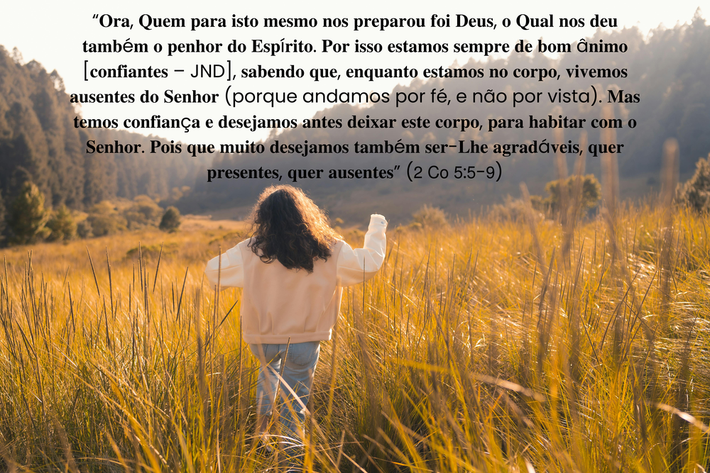 “Ao falar da garantia da salvação, muitas vezes nos deparamos com respostas como: “Não é bom ter tanta certeza” ou “Não é presunção?” ou “Eu não acho correto estar tão confiante”. Se alguém acostumado a dar essas respostas, rogamos sinceramente que considerem a passagem da Escritura onde aparecem as palavras no início deste artigo, e sentimos certeza de que não falarão mais assim. Vamos citá-lo: “Ora, Quem para isto mesmo nos preparou foi Deus, o Qual nos deu também o penhor do Espírito. Por isso estamos sempre de bom ânimo [confiantes – JND], sabendo que, enquanto estamos no corpo, vivemos ausentes do Senhor (porque andamos por fé, e não por vista). Mas temos confiança e desejamos antes deixar este corpo, para habitar com o Senhor. Pois que muito desejamos também ser-Lhe agradáveis, quer presentes, quer ausentes” (2 Co 5:5-9).”